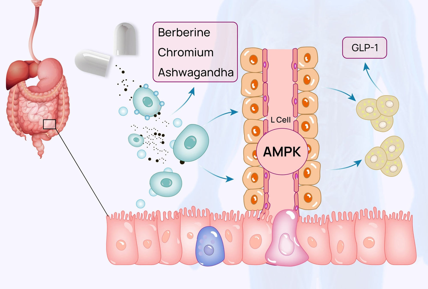 Upon stimulation, specialized gut L-cells begin releasing GLP-1 into the bloodstream — a hormone key to regulating appetite and metabolism.