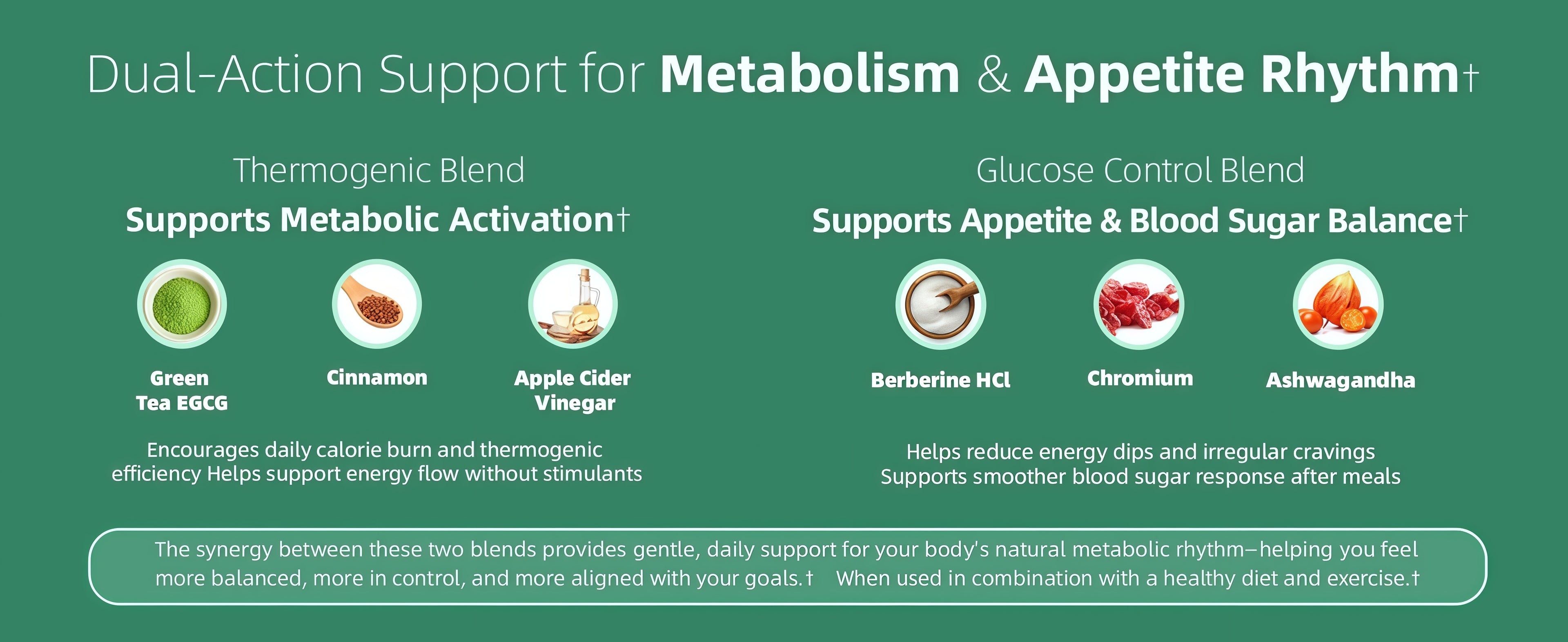 Achieving healthy metabolism is more than just eating less or exercising more. Your body’s appetite rhythm, blood sugar balance, and energy use are regulated by natural metabolic pathways like GLP-1. But these systems can become dysregulated by stress, poor sleep, or age. That’s why Metaburn is designed for daily support — with a dual-action blend of Berberine, Chromium, Green Tea EGCG, and B12 to help balance glucose levels, reduce energy crashes, and keep cravings in check — gently, every day.